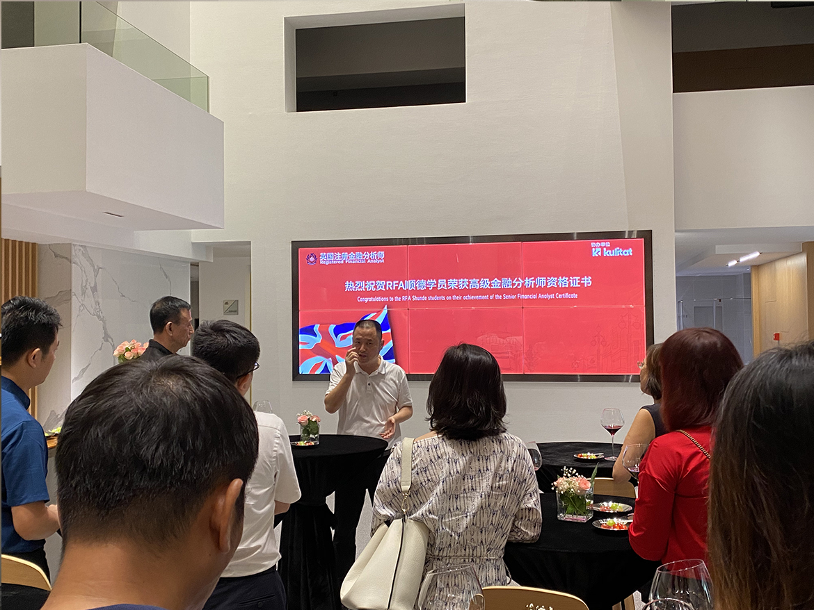 9月19日,RFA英國注冊金融分析師—順德首期學員頒證典禮在kulitat庫靈圖華南運營中心如期舉行。活動期間,庫靈圖中華區總裁李林鴻先生為現場學員嘉賓們致以了熱烈的歡迎和誠摯的問候,同時十分榮幸地邀請到了清華大學博士后、本科生導師——楊博士,為學員們頒發證書。